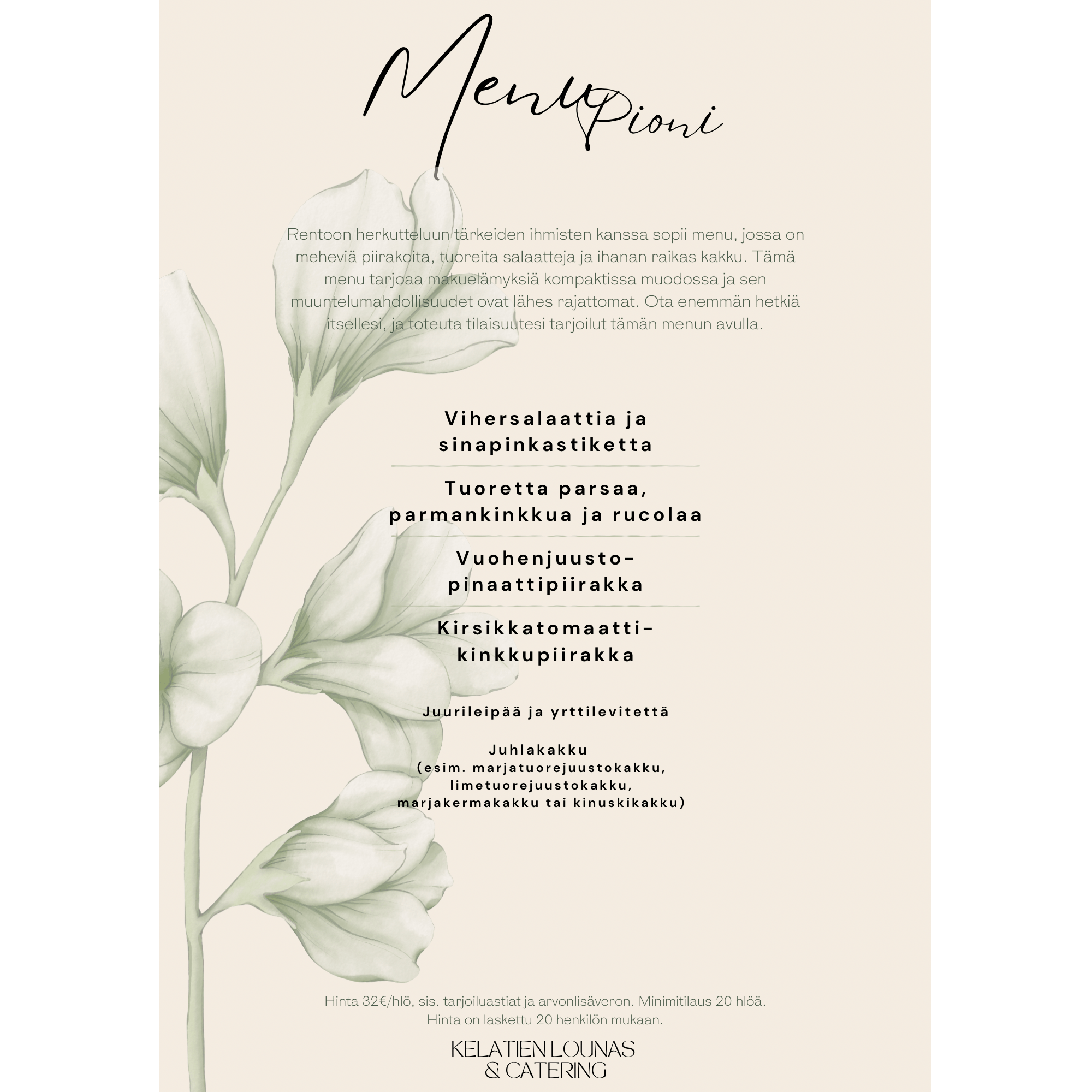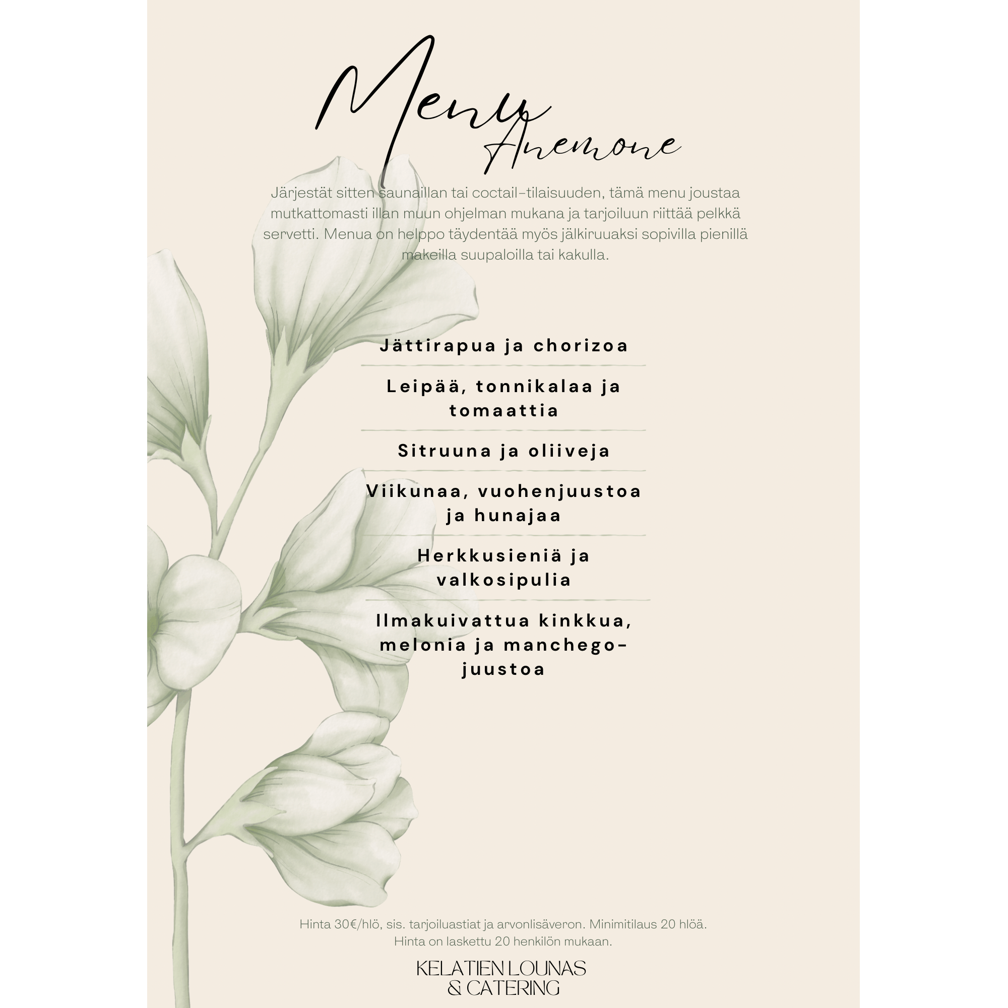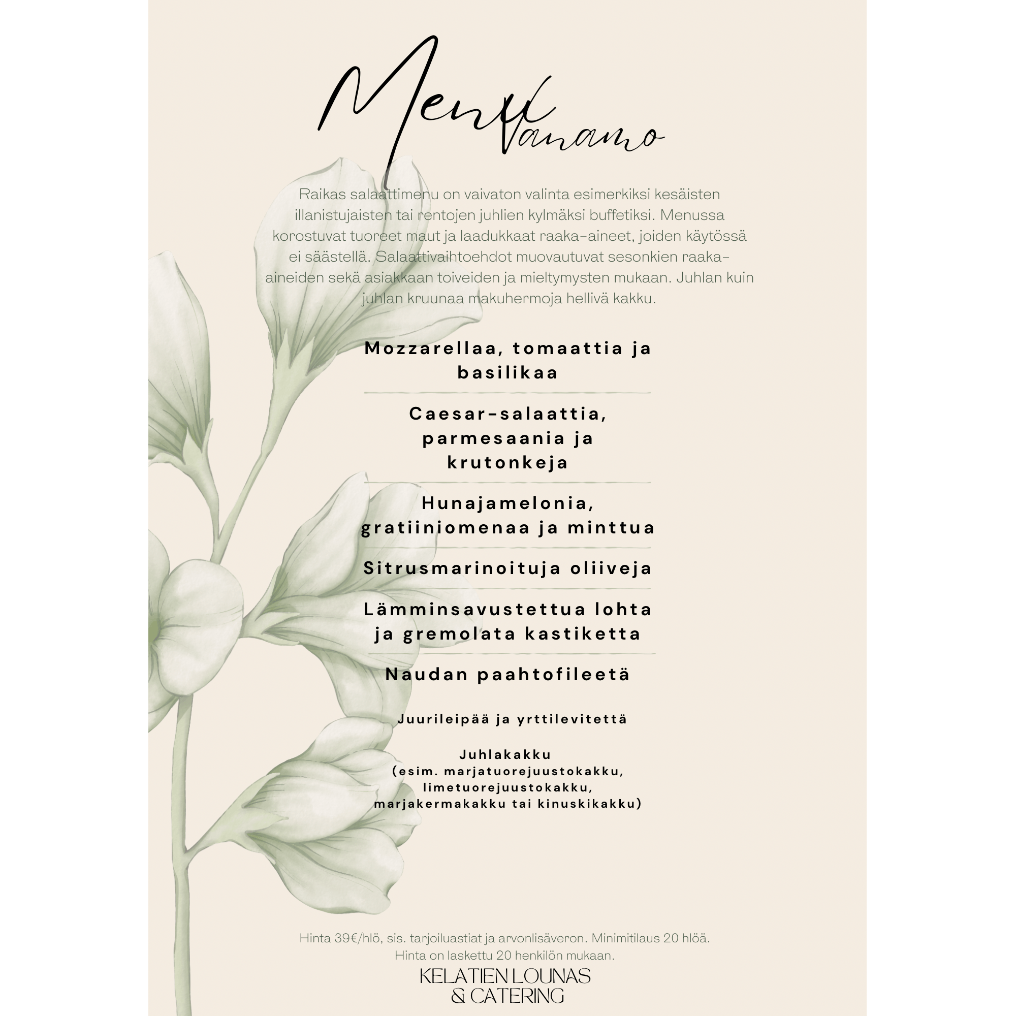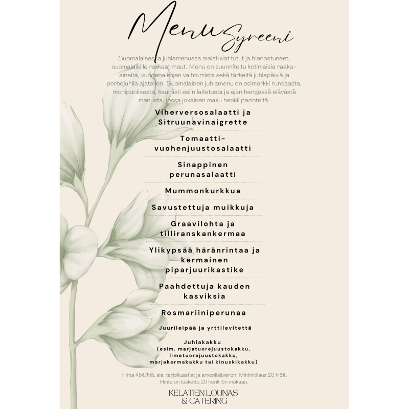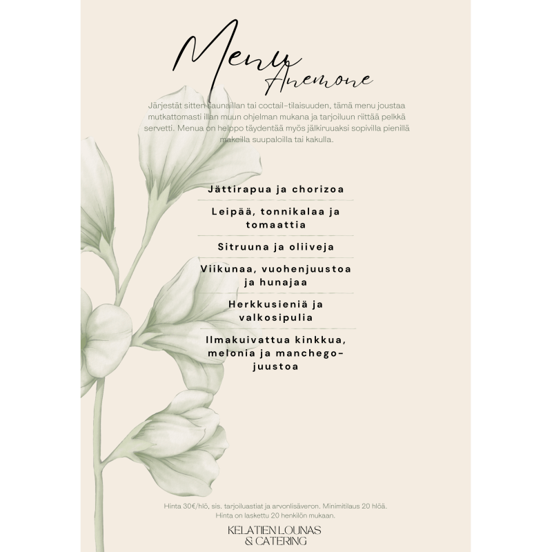 Menuehdotusten hinnat ovat laskettu alk. 20 hengelle,